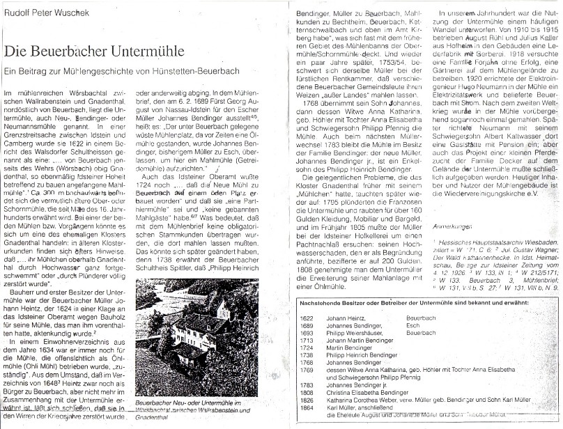 Im Jahre 1622 wird die Mühle in einem Bericht des Schultheissen von Walsdorf erstmals schriftlich erwähnt. Beuerbacher Untermühle, Neu-, Neumanns, oder Bendingermühle sind andere Bezeichnungen. Die Mühle wurde schon für die vielfältigsten Zwecke genutzt.